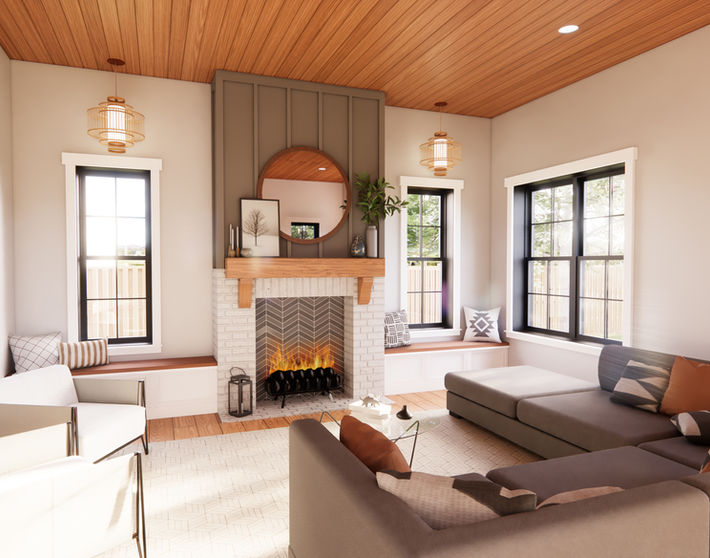 The exterior materials reinforce the home’s warm modern character, combining vertical wood cladding, board-and-batten siding, and painted brick for a balanced, textured look. Large black-framed windows complete the updated street presence and bring even more daylight into the interior.